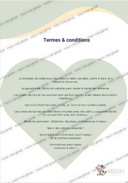 Détournant les codes des factures classiques, ce petit bijou de créativité détaille avec humour et tendresse une commande très spéciale : un bébé en route ! Entre livraison prévue, quantité d’amour illimitée et câlins en stock infini, vos proches vont fondre dès la lecture.