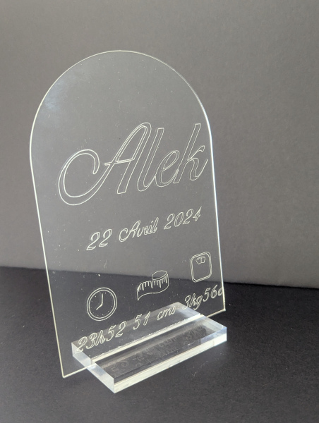 Gravure sur une plaque en acrylique transparente personnalisable – Le souvenir parfait de la naissance de votre bébé.