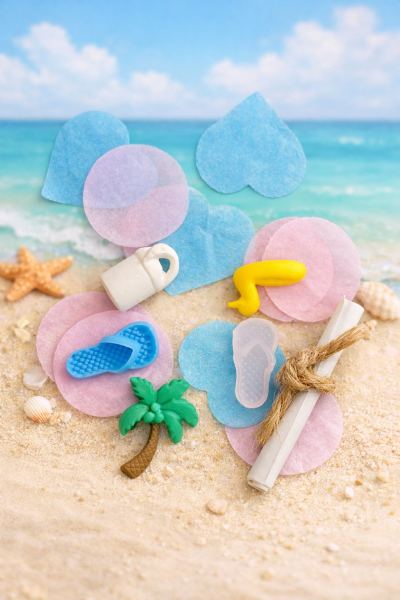 À l’intérieur, 5 aimants décoratifs inspirés de l’univers de la plage, des confettis roses et bleus qui laissent un indice et un message surprise annonçant la grossesse de façon surprenante et mémorable.
