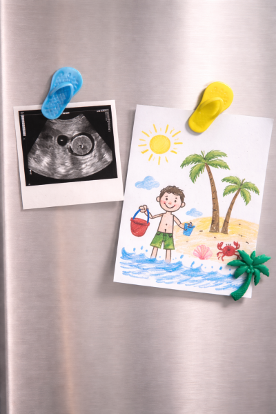 Les aimants en résine, faits main, deviennent ensuite des souvenirs du quotidien, accrochés au frigo pour maintenir échographies, dessins d’enfant ou petits mots précieux.