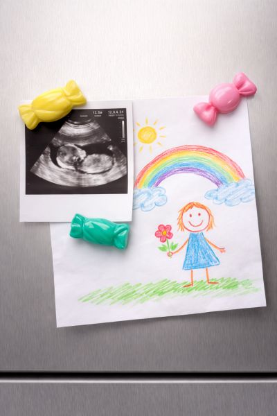 Les aimants en résine, faits main, deviennent ensuite des souvenirs du quotidien, accrochés au frigo pour maintenir échographies, dessins d’enfant ou petits mots précieux.
