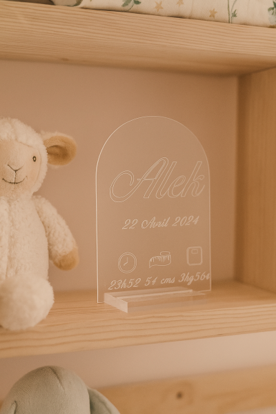 Gravure sur une plaque en acrylique transparente personnalisable – Le souvenir parfait de la naissance de votre bébé.